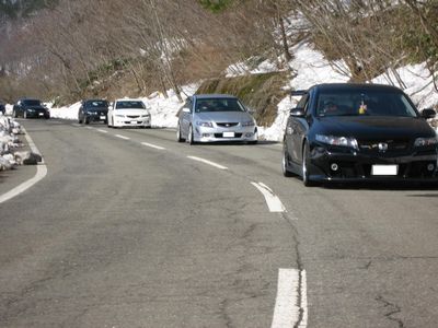 | 国道426号線から、国道482号線に入ります。 この辺りまで来ると、まだ雪がたくさん残ってます。 勿論、道路上は除雪されてますので、通行に支障がある事はありません。 国道482号線に入り、県道2号線に入って出石の中心部に向かいます。 町営の駐車場に入り、ここで全車揃ってアコードポーズ(⌒∇⌒) |