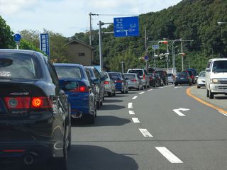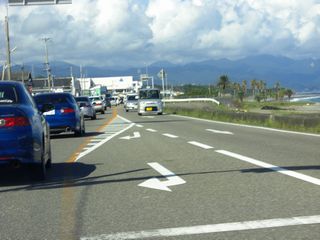 | 国道42号線に戻り、ひたすら走ります。 せんべい屋に寄った都合で、道の駅・志原海岸に寄る予定でしたが、一気に潮岬まで向かう事にしました。 国道42号線は、和歌山県と三重県の海岸線を通る、紀伊半島にとって最大の主要国道です。 この国道周辺は大きな被害はありませんでしたが、矢張り川の水位は多く、 まだ泥水が流れていましたね。川によっては水位が以前い戻っている川もあります。 上流の被害によって違うんですね。 ここまで大きな渋滞もなく、潮岬に到着です。 |