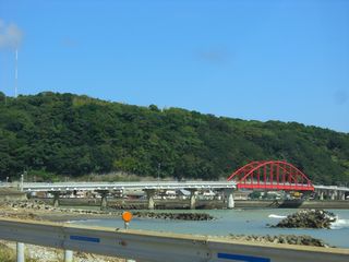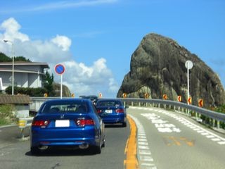 | 国道42号線に戻り、次の目的地、道の駅・なちに向かいます。 海岸線に近いところを通るこの国道は、今日の様に天気のいい日は最高です。 写真の橋杭岩も絶景です。 矢張り災害の影響もあって道路もよく空いています。 |