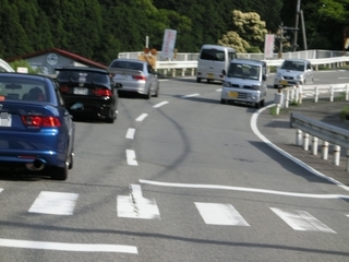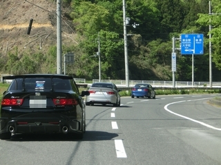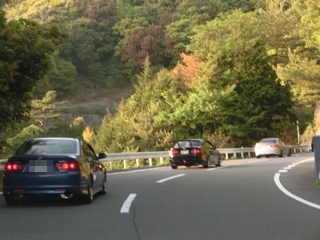 | 国道311号線から国道42号線に入り、海鮮せんべい南紀に到着です。 ここで偶然にも走行会に参加してくれているアイアンマンさんと遭遇しました。 彼女とドライブに来ていた様で、可愛い彼女で羨ましい限りですねぇ(笑) お家のお土産も買って、さてどうするか・・・時間的にいつもならこの辺りで解散って事もありましが、 どうも阪和自動車道が渋滞している模様で。 日も長くなっているし、だったらと言うことで即決山越えルートを選択(笑) ここまでも結構な距離を走っているのですが、まだまだアコードパレードは続きます。 国道42号線から県道29号線に入ります。 この県道29号線もお勧めの道路です。景色も綺麗し路面状態も安定していて走るのには快適で楽しい道路です。 |